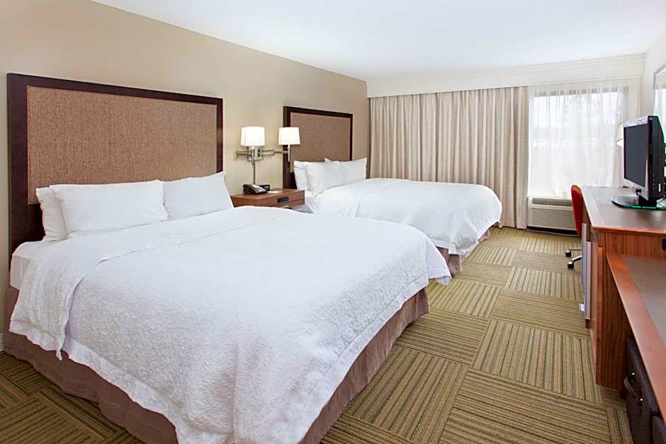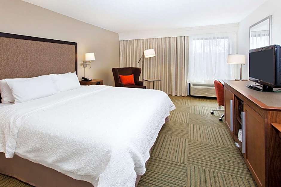 Whirlpool, work area, free WiFi, tea/coffeemaker, easy chair with ottoman Settle into this spacious suite and enjoy a bit of pampering in a relaxing whirlpool tub. Watch your favorite show on TV and sleep deep in the bedroom that features our king-sized clean and fresh Hampton bed®. There is also an in-room tea/coffeemaker for added convenience. The suite includes a spacious work desk and free WiFi to let you stay productive when traveling. The bathroom offers fluffy towels, a WaterPik® showerhead and curved shower rod that allows for more light and space.